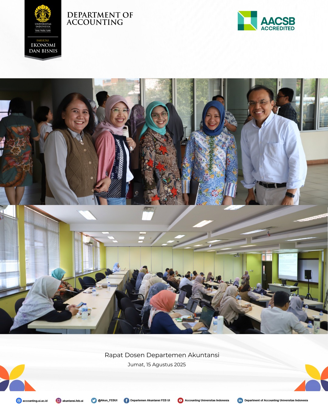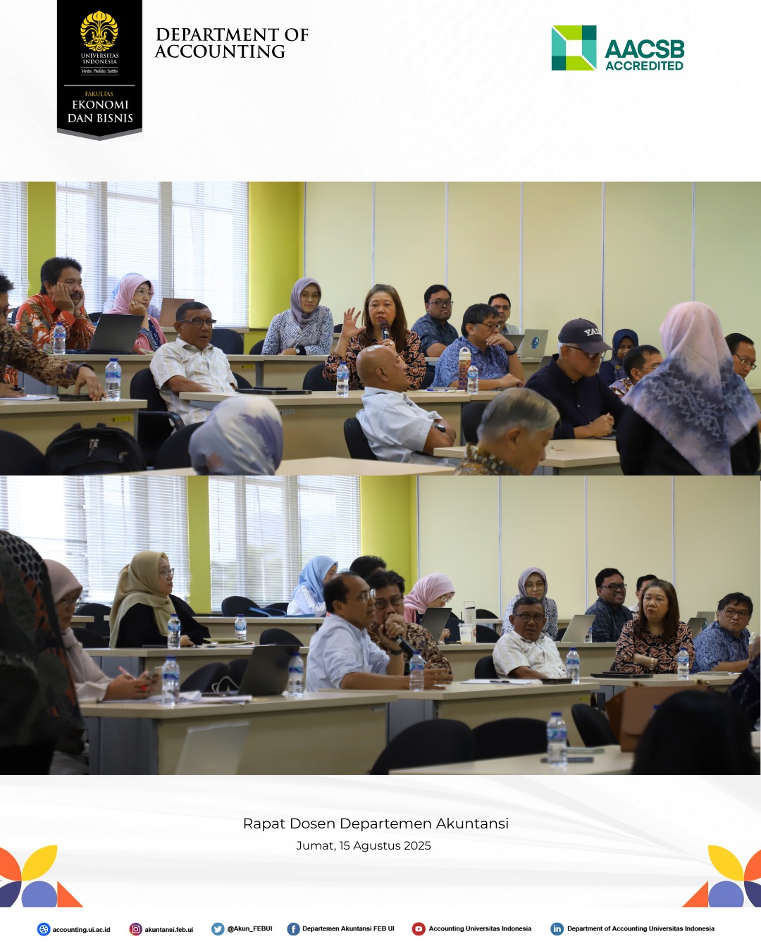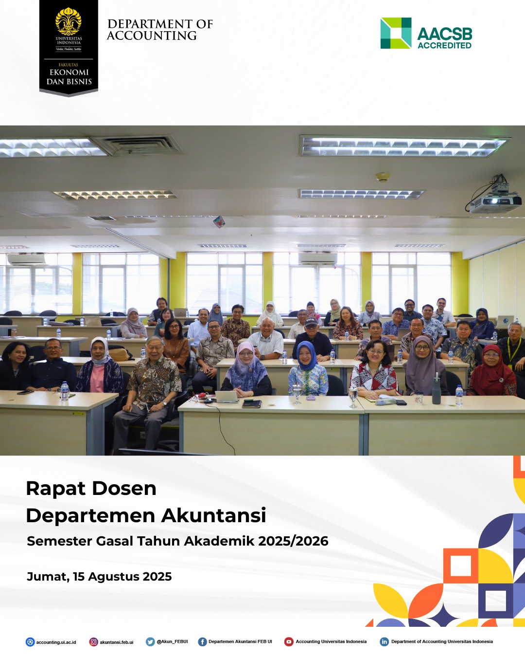 Departemen Akuntansi Fakultas Ekonomi dan Bisnis Universitas Indonesia (FEB UI) telah menyelenggarakan Rapat Dosen Semester Gasal Tahun Akademik 2025/2026 pada Jumat, 15 Agustus 2025, di Gedung Pascasarjana FEB UI, Kampus UI Depok.