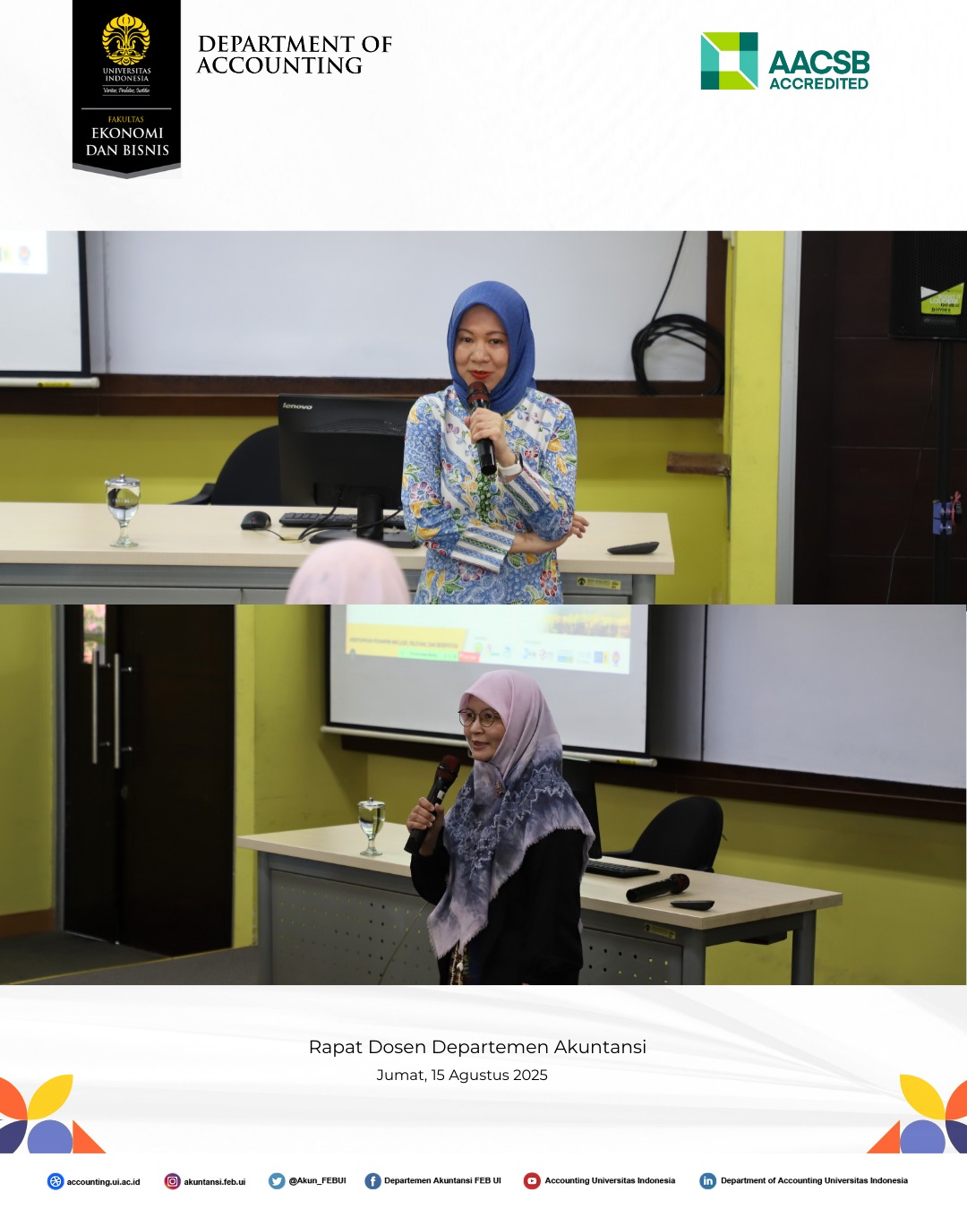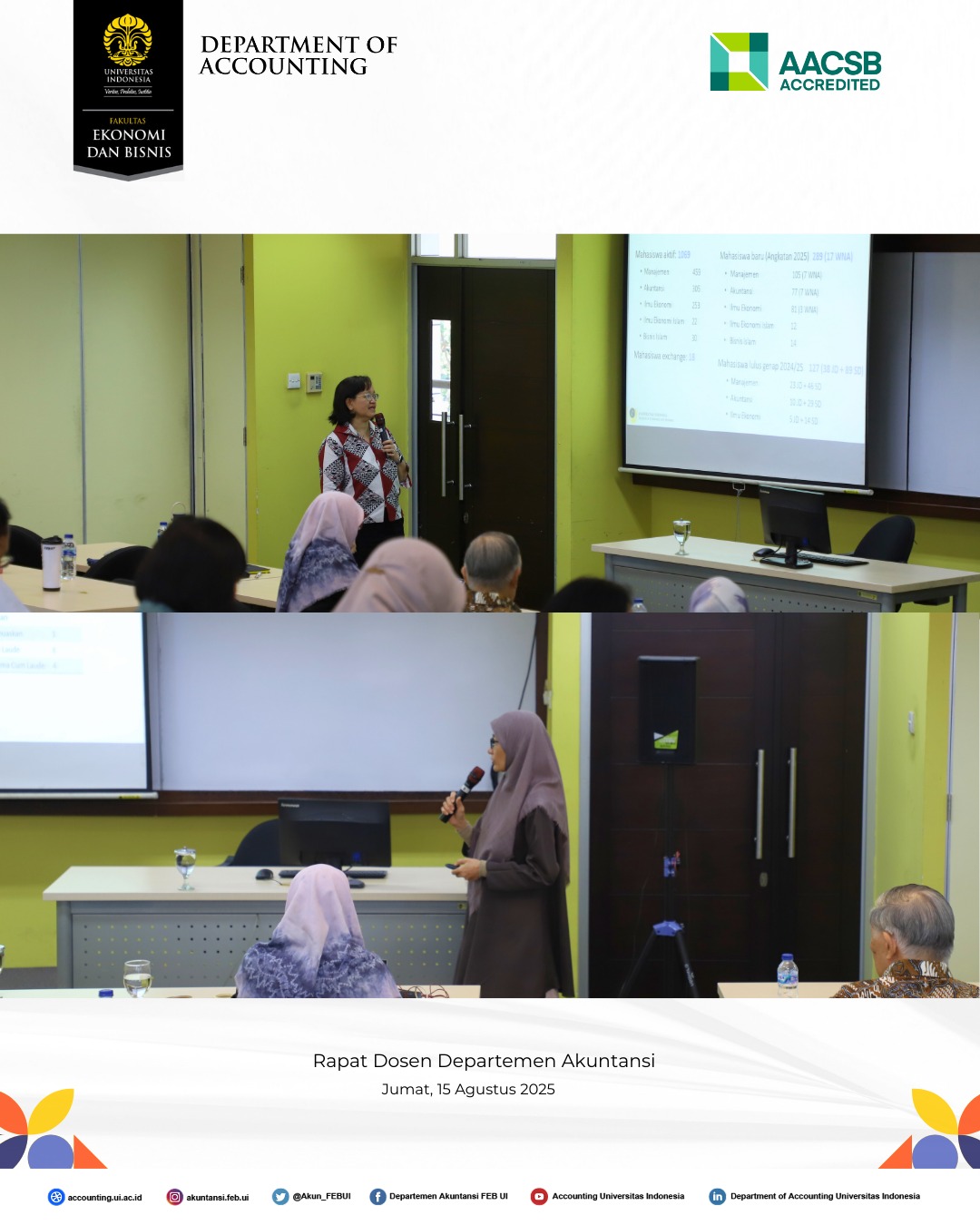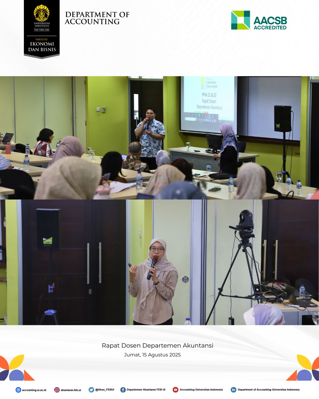 Departemen Akuntansi Fakultas Ekonomi dan Bisnis Universitas Indonesia (FEB UI) telah menyelenggarakan Rapat Dosen Semester Gasal Tahun Akademik 2025/2026 pada Jumat, 15 Agustus 2025, di Gedung Pascasarjana FEB UI, Kampus UI Depok.