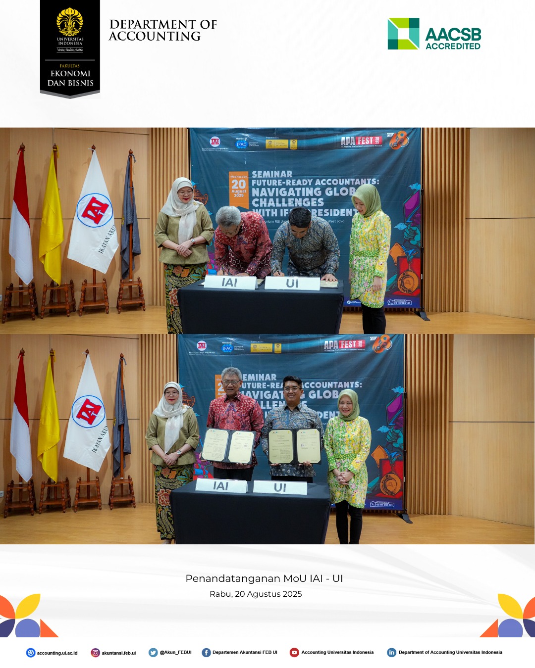 Rabu, 20 Agustus 2025 – Universitas Indonesia bersama Ikatan Akuntan Indonesia secara resmi menandatangani perpanjangan Nota Kesepahaman (MoU). Penandatanganan dilakukan oleh Rektor UI, Prof. Dr. Ir. Heri Hermansyah, S.T., M.Eng., IPU, dan Ketua Dewan Pengurus Nasional (DPN) IAI, Dr. Ardan Adiperdana, Ak., MBA., CFrA., CA., FCMA., CGMA.