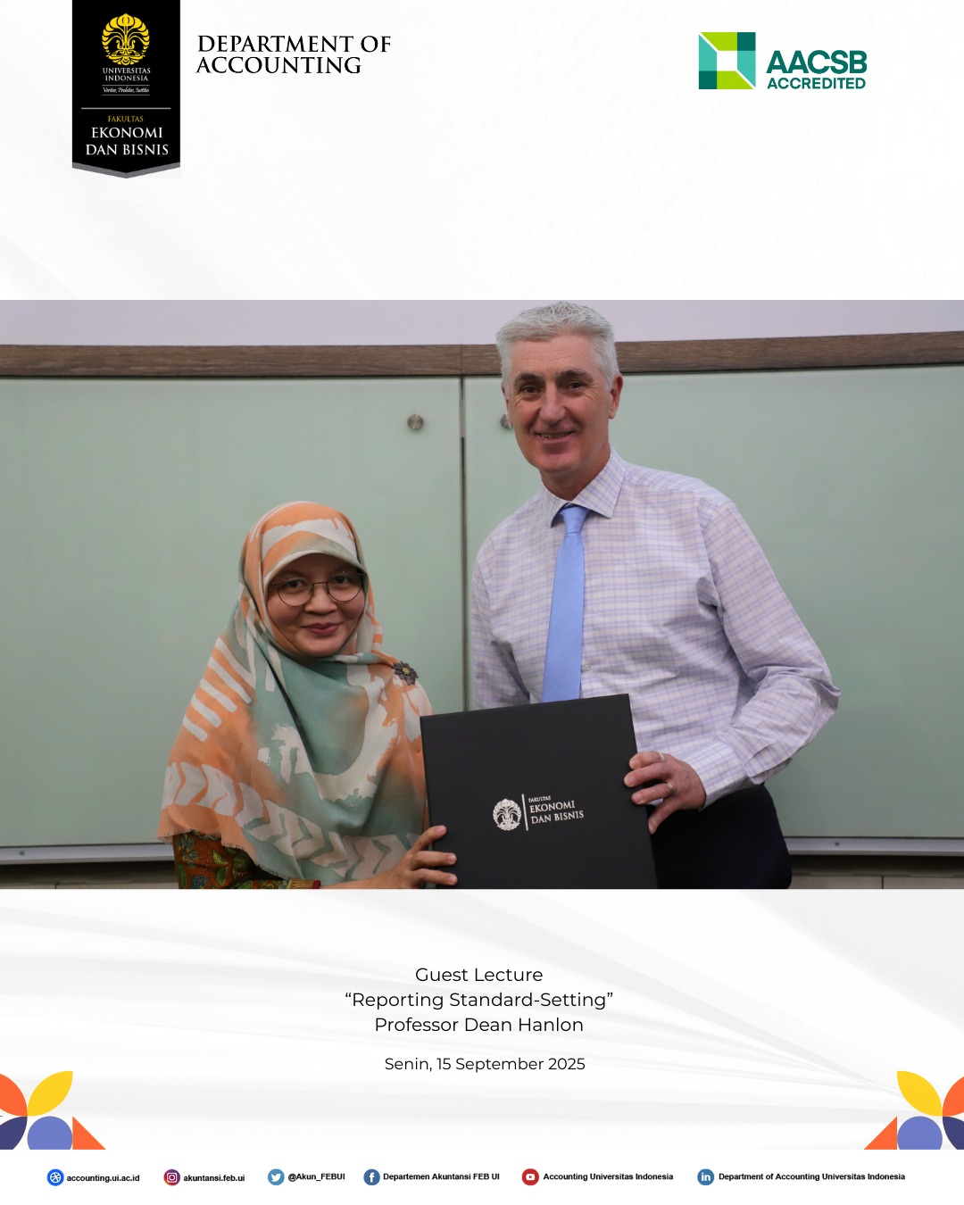[GUEST LECTURE: REPORTING STANDARD-SETTING]Depok, 15 September 2025 – Departemen Akuntansi FEB UI telah menyelenggarakan acara Guest Lecture dengan tema “Reporting Standard-Setting” di ruang Istama Lt. 2 Departemen Akuntansi FEB UI, Kampus Depok.Guest Lecture ini menghadirkan narasumber, Professor Dean Hanlon yang merupakan Deputy Head, Department of Accounting RMIT University, Melbourne, Australia dan Board member of the...Read More
