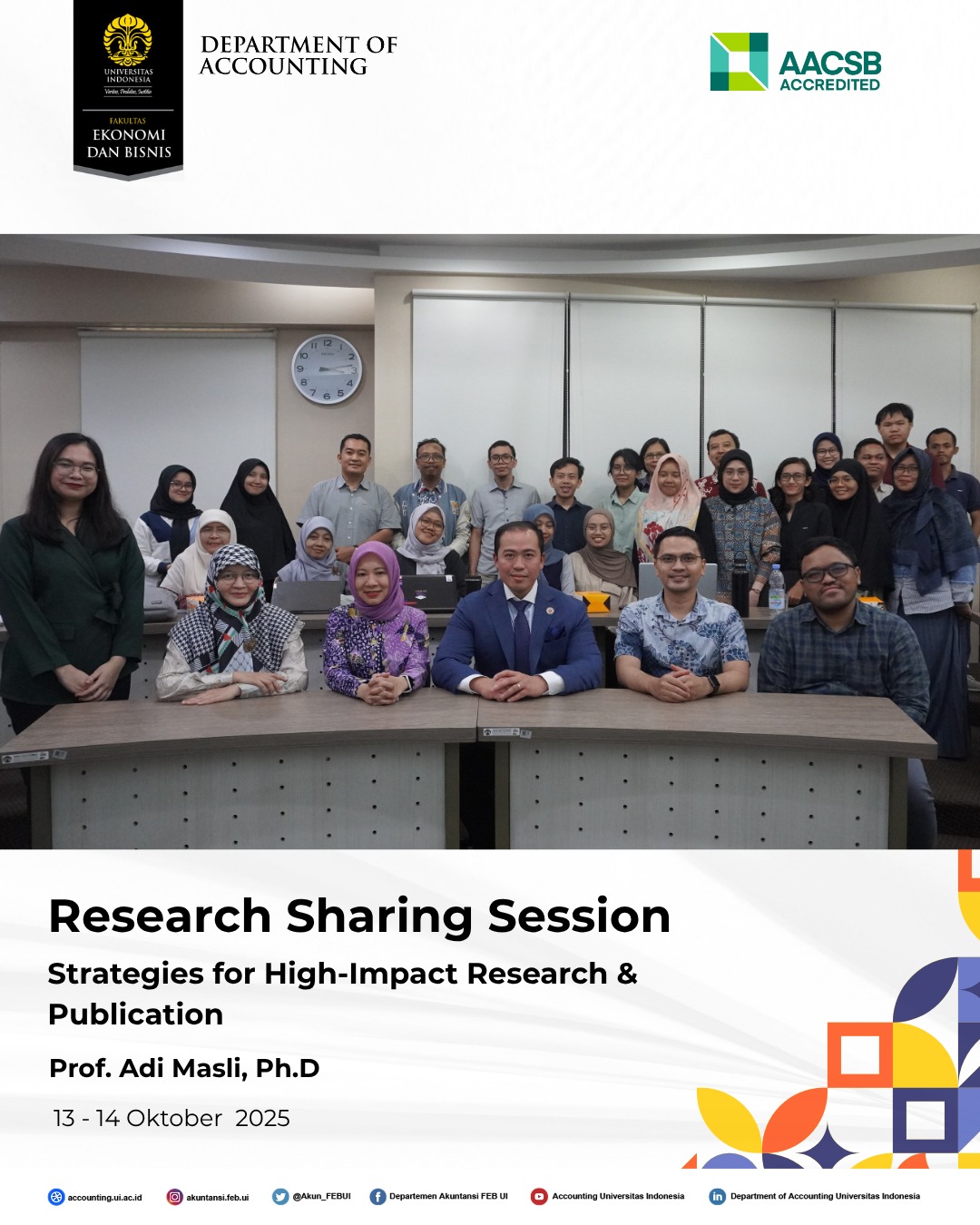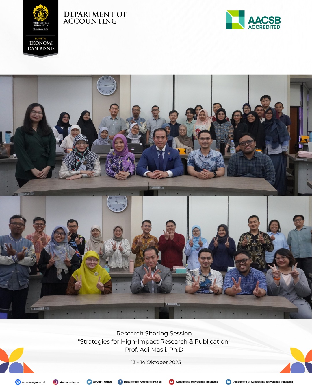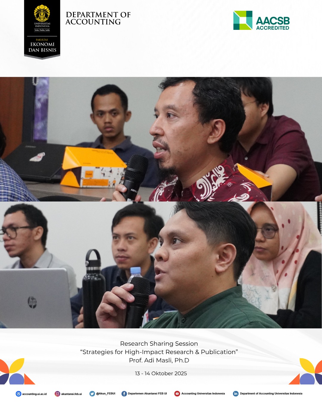 Depok, 13–14 Oktober 2025 – Departemen Akuntansi FEB UI telah menyelenggarakan Research Sharing Session yang berlangsung di Ruang Istama Lt. 2, Departemen Akuntansi FEB UI, Kampus Depok.