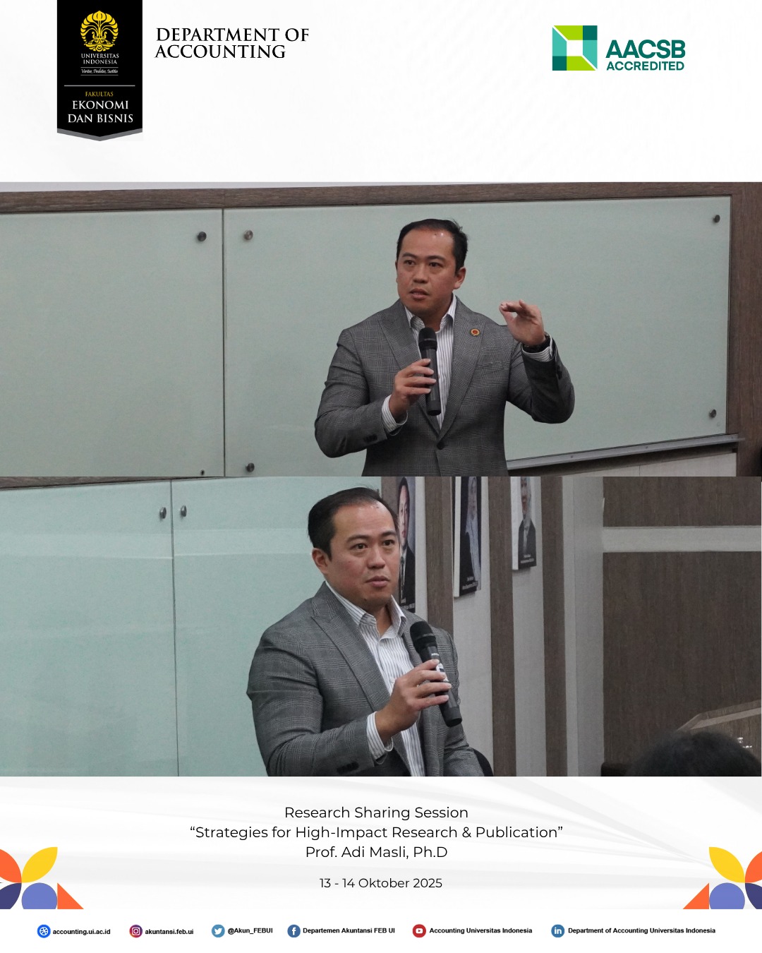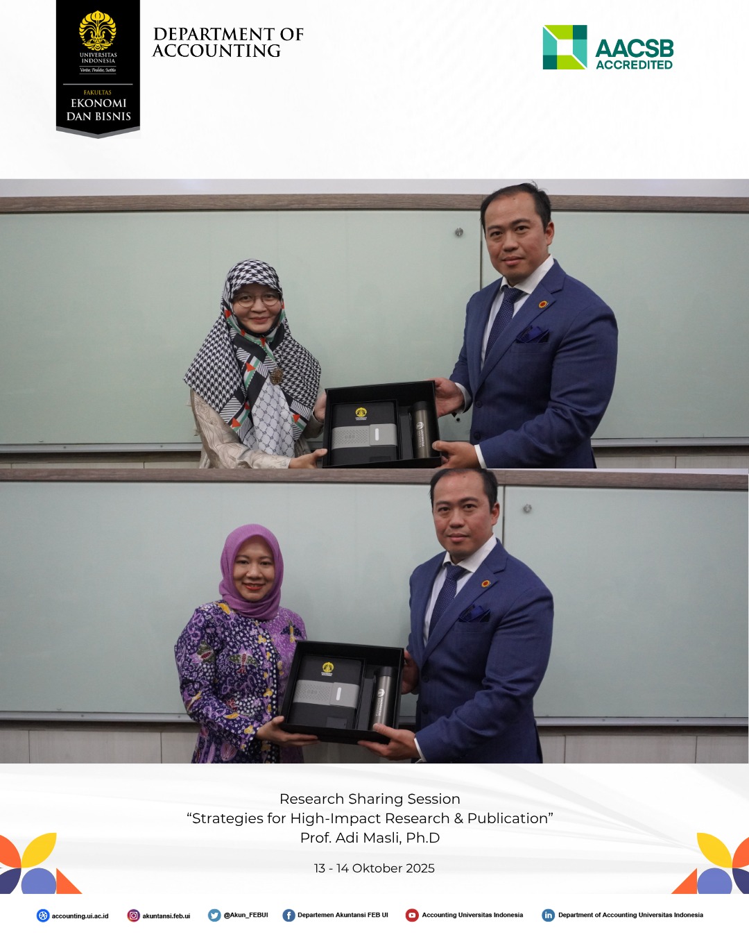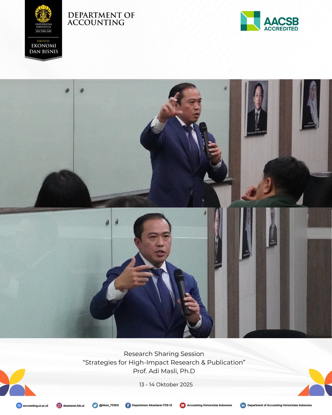 Depok, 13–14 Oktober 2025 – Departemen Akuntansi FEB UI telah menyelenggarakan Research Sharing Session yang berlangsung di Ruang Istama Lt. 2, Departemen Akuntansi FEB UI, Kampus Depok.