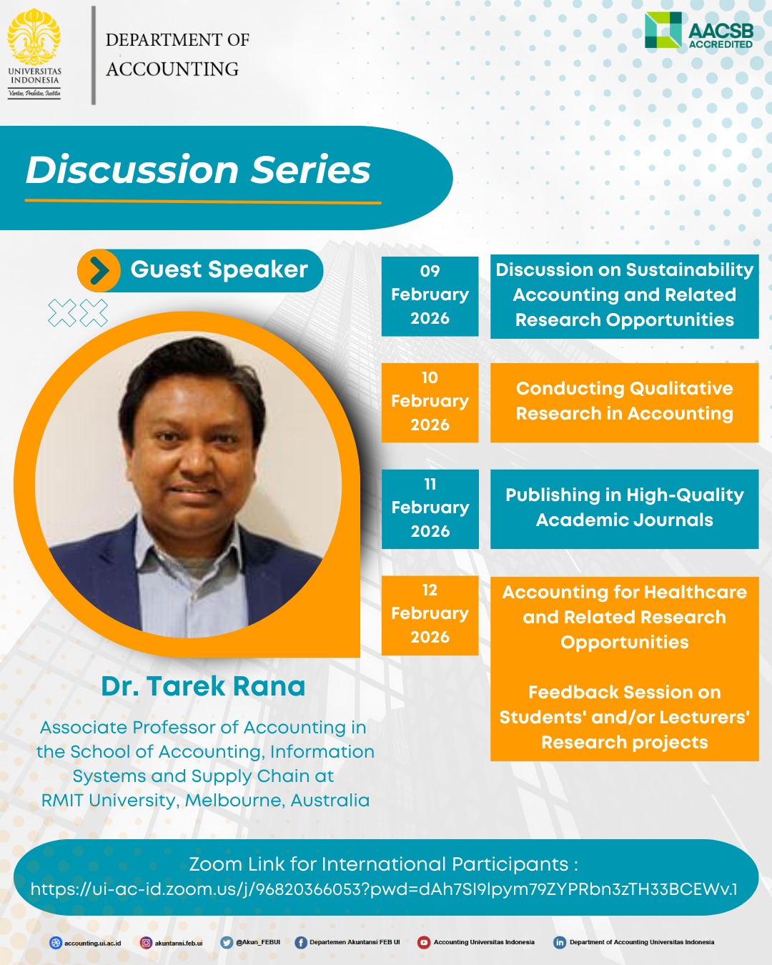 Departemen Akuntansi Fakultas Ekonomi dan Bisnis Universitas Indonesia Menyelenggarakan Discussion Series Bersama RMIT University: Penguatan Riset, Publikasi, dan Kolaborasi InternasionalDepartemen Akuntansi, Fakultas Ekonomi dan Bisnis Universitas Indonesia (FEB UI) kembali menghadirkan suasana akademik internasional melalui Discussion Series pada 9–13 Februari 2026. Kegiatan ini menghadirkan Dr. Tarek Rana, Associate Professor of Accounting in the School of...Read More