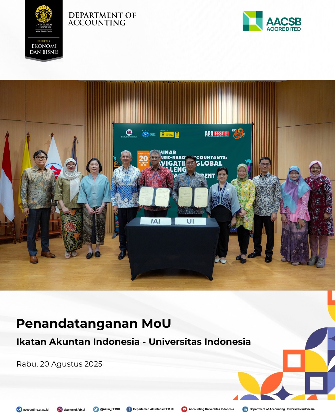 [PENANDATANGANAN PERPANJANGAN MoU IAI – UI]Rabu, 20 Agustus 2025 – Universitas Indonesia bersama Ikatan Akuntan Indonesia secara resmi menandatangani perpanjangan Nota Kesepahaman (MoU). Penandatanganan dilakukan oleh Rektor UI, Prof. Dr. Ir. Heri Hermansyah, S.T., M.Eng., IPU, dan Ketua Dewan Pengurus Nasional (DPN) IAI, Dr. Ardan Adiperdana, Ak., MBA., CFrA., CA., FCMA., CGMA.Perpanjangan MoU ini bertujuan...Read More