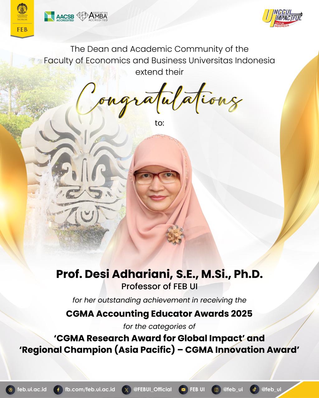 [SELAMAT ATAS PENGHARGAAN CGMA ACCOUNTING EDUCATOR AWARDS 2025]Fakultas Ekonomi dan Bisnis Universitas Indonesia mengucapkan,“Selamat atas pencapaian Prof. Desi Adhariani, S.E., M.Si., Ph.D. yang berhasil meraih penghargaan Chartered Global Management Accountant (CGMA) Accounting Educator Awards 2025 dalam kategori Research Award for Global Impact dan Regional Champion (Asia Pacific) CGMA Innovation Award” ✨Semoga pencapaian ini semakin menginspirasi...Read More