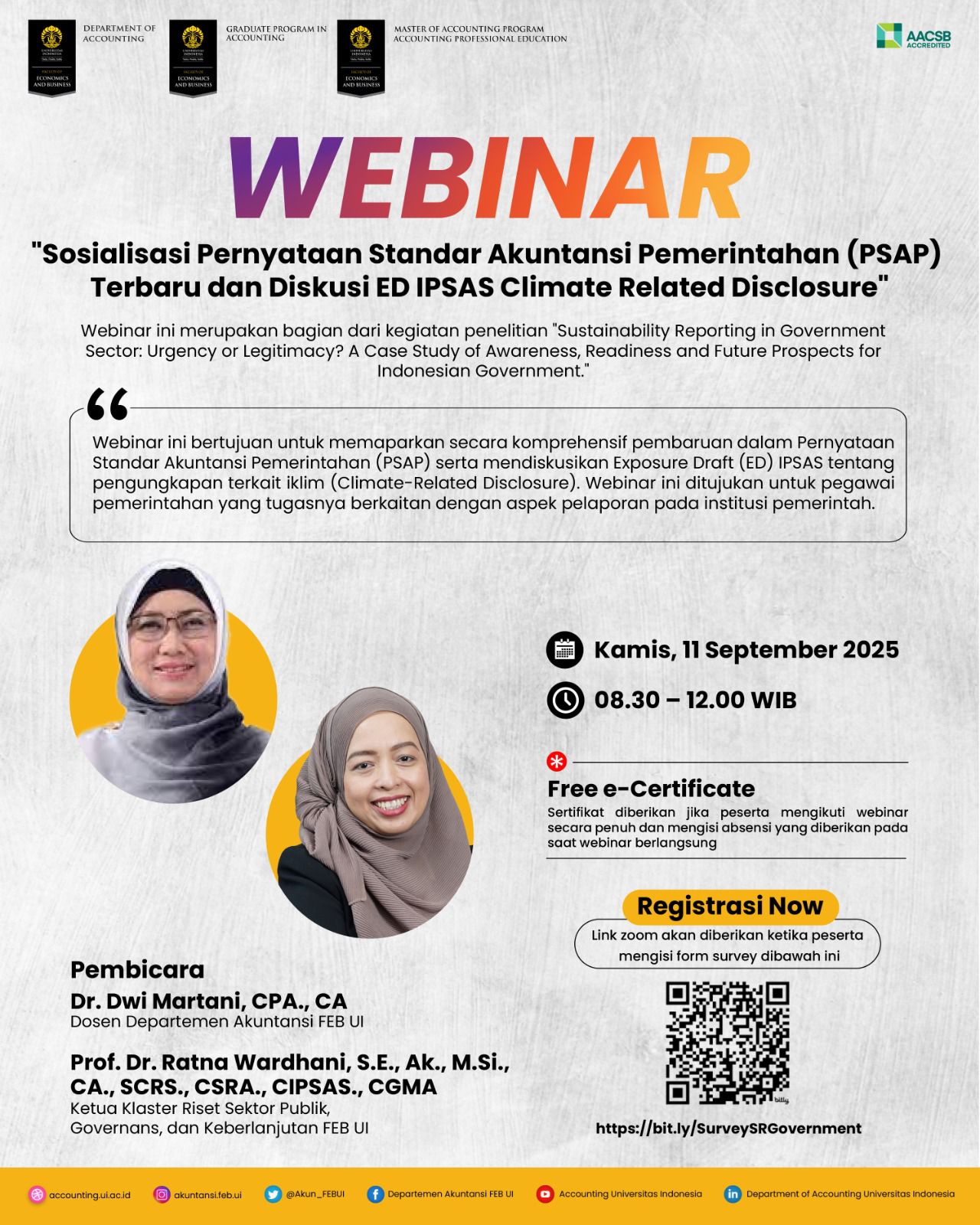 WEBINAR 📢 Sosialisasi Pernyataan Standar Akuntansi Pemerintahan (PSAP) Terbaru dan Diskusi ED IPSAS Climate Related Disclosure 📢 Webinar ini merupakan bagian dari kegiatan Riset Laporan Keberlanjutan (Sustainabilty Report) pada Sektor Pemerintah, yang diselenggarakan oleh Klaster Riset Sektor Publik, Governans, dan Keberlanjutan Departemen Akuntansi FEB Universitas Indonesia. 📍 Pendaftaran dilakukan dengan mengisi survei penelitian berikut: https://bit.ly/SurveySRGovernment...Read More