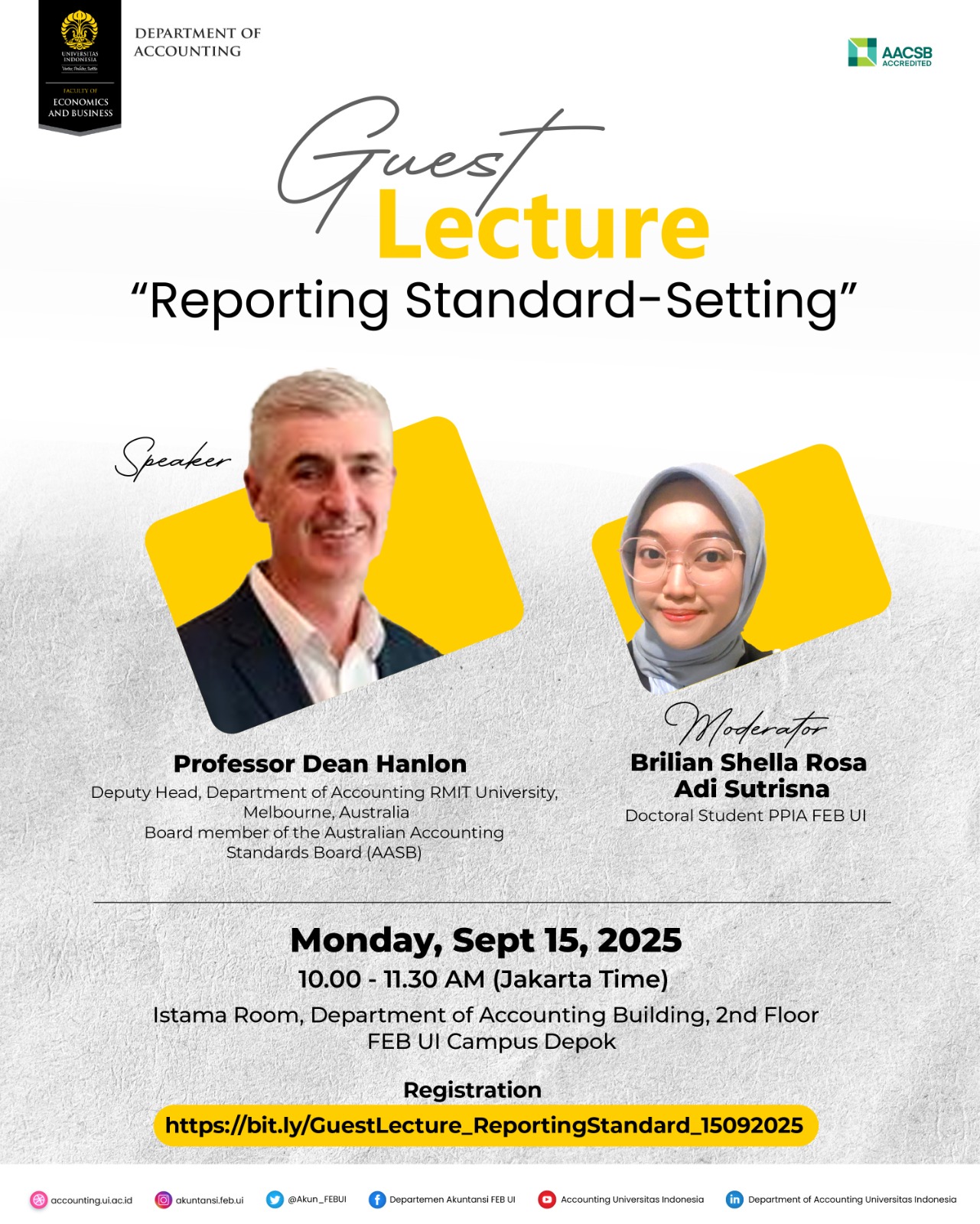📣 Guest Lecture 📣 Departemen Akuntansi Fakultas Ekonomi dan Bisnis Universitas Indonesia, mengundang Bapak/Ibu Dosen dan Mahasiswa untuk hadir pada acara Guest Lecture dengan topik “Reporting Standard-Setting” yang akan diselenggarakan pada: 📆 Senin, 15 September 2025 ⏰ 10.00 – 11.30 WIB 📍 Ruang Istama, Lantai 2 Gedung Departemen Akuntansi, Kampus UI Depok Pembicara: Professor Dean...Read More