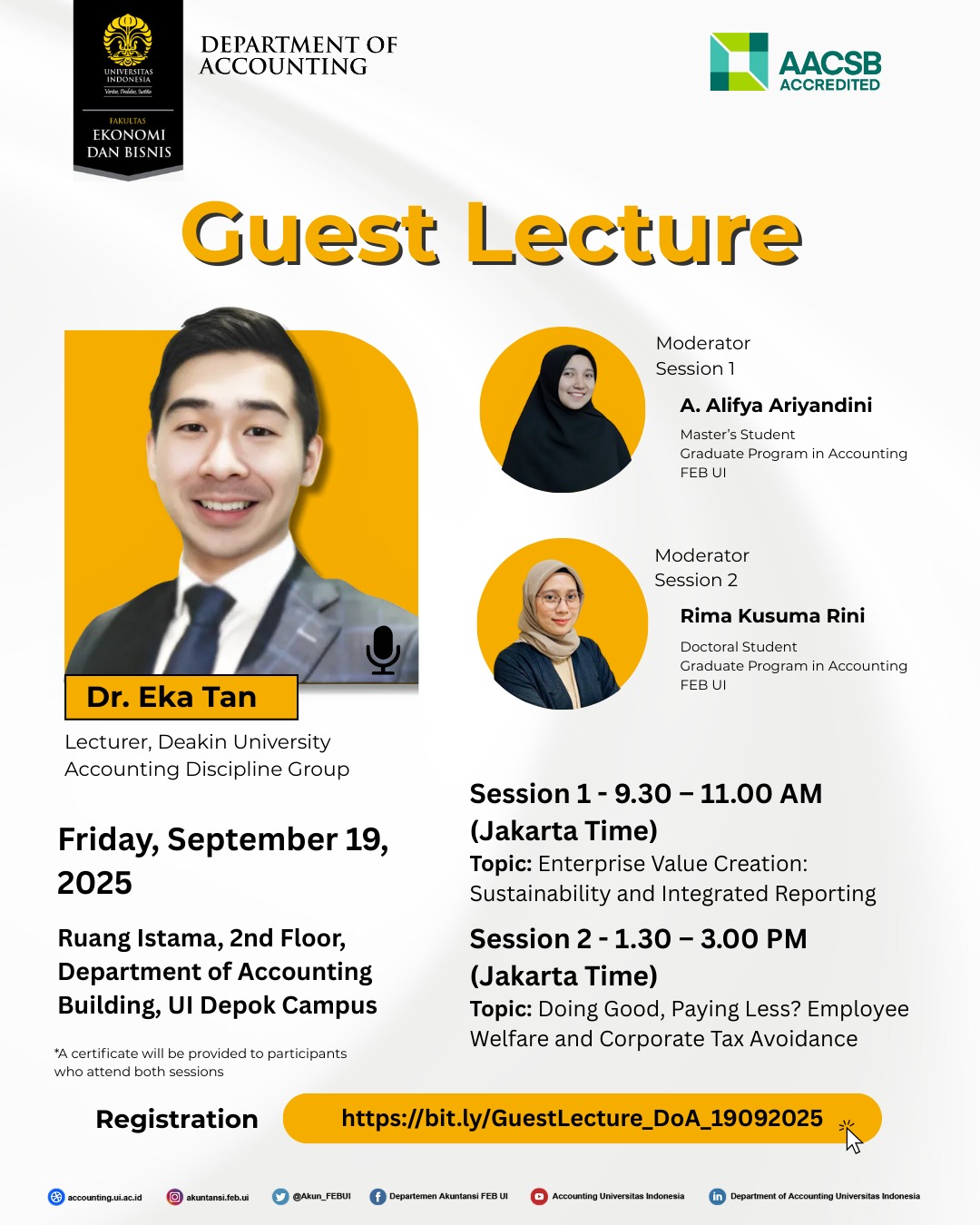 📣 Guest Lecture 📣 The Department of Accounting, Faculty of Economics and Business, Universitas Indonesia, cordially invites lecturers and students to attend a Guest Lecture, which will be held as follows: 📆 Friday, 19 September 2025 📍 Ruang Istama, 2nd Floor, Department of Accounting Building, UI Depok Campus 🗣️ Speaker: Dr. Eka Tan Lecturer, Deakin...Read More