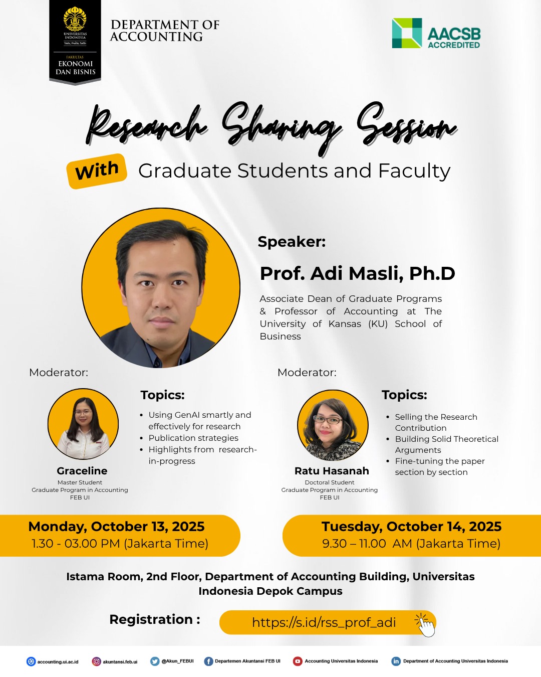 [Research Sharing & Feedback Sessions with Prof. Adi Masli] The Department of Accounting, FEB UI, cordially invites Faculty Members and Students to a series of sessions with Prof. Adi Masli, Ph.D., on October 13–15, 2025, at Istama Room, Department of Accounting, Universitas Indonesia, Depok. Program Schedule: 1. Research Sharing Session with Graduate Students and Faculty 🗓️ Monday, October 13,...Read More