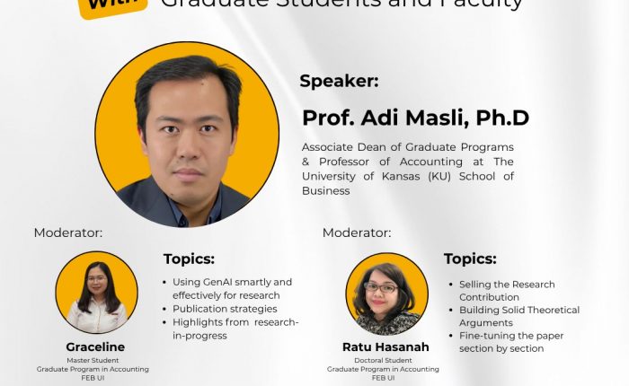 [Research Sharing & Feedback Sessions with Prof. Adi Masli] The Department of Accounting, FEB UI, cordially invites Faculty Members and Students to a series of sessions with Prof. Adi Masli, Ph.D., on October 13–15, 2025, at Istama Room, Department of Accounting, Universitas Indonesia, Depok. Program Schedule: 1. Research Sharing Session with Graduate Students and Faculty 🗓️ Monday, October 13,...